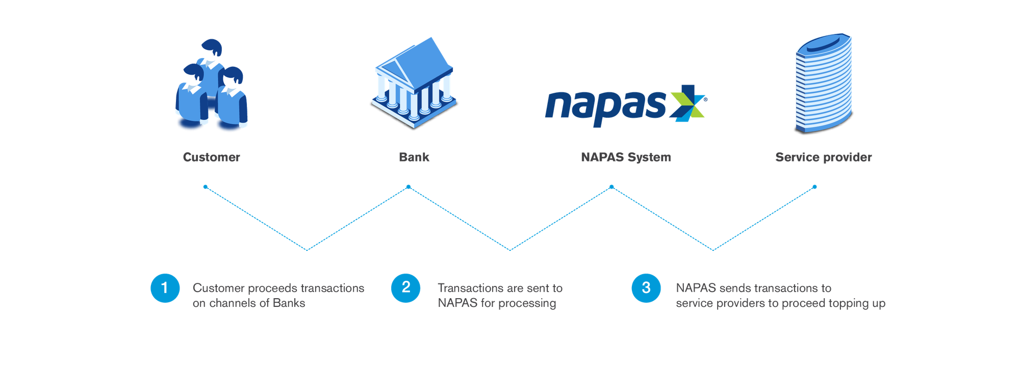 Telecom Top-up Service is the service provided by NAPAS to Banks/Agents allowing holders of cards/accounts issued by Banks/Agents to top-up their prepaid service accounts (mobile phone accounts, digital content services, etc.) of service providers connected to NAPAS in anytime, anywhere by the Bank/Agent’s transaction channels including but not limited to such as: Internet Banking, Mobile Banking, SMS Banking, Kiosk Banking, ATM, POS, Transaction Counter.
